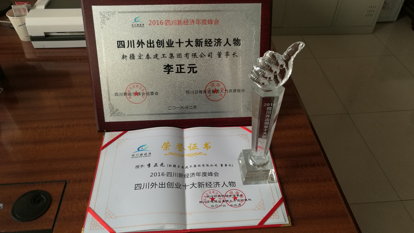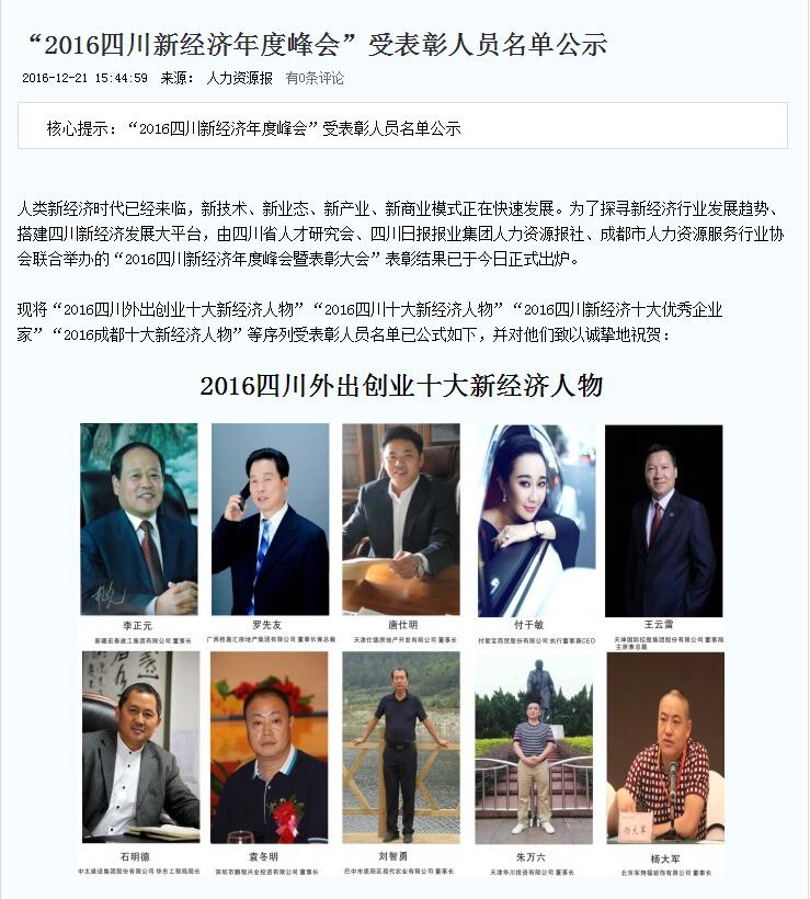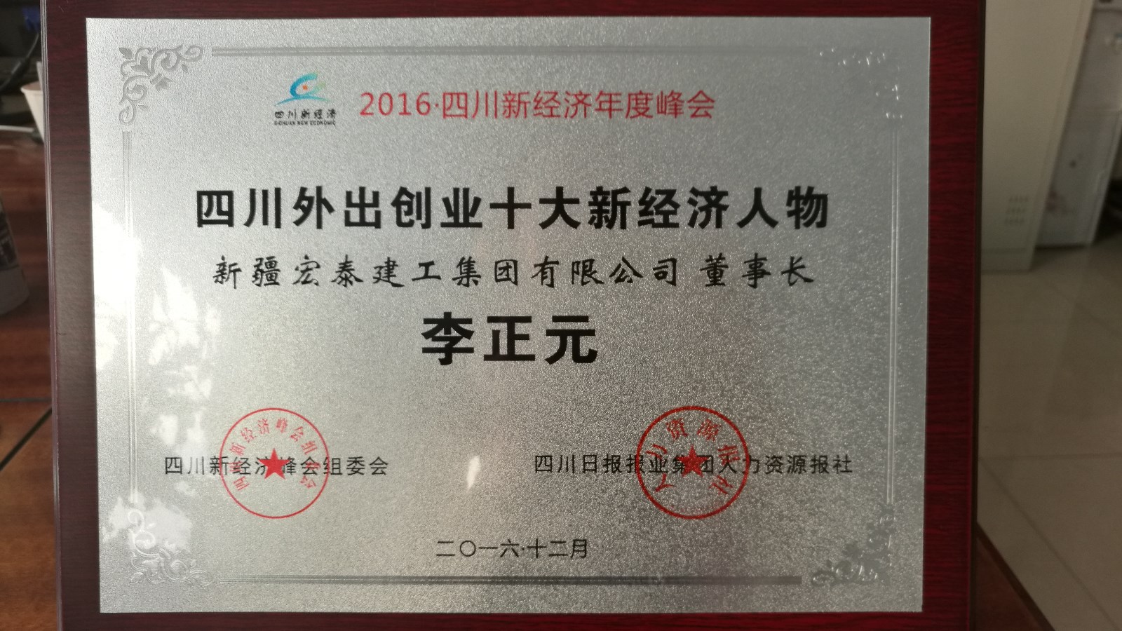 新疆宏泰建工集團有限公司董事局主席李正元同志被評選為“2016四川外出創(chuàng)業(yè)十大新經(jīng)濟人物”